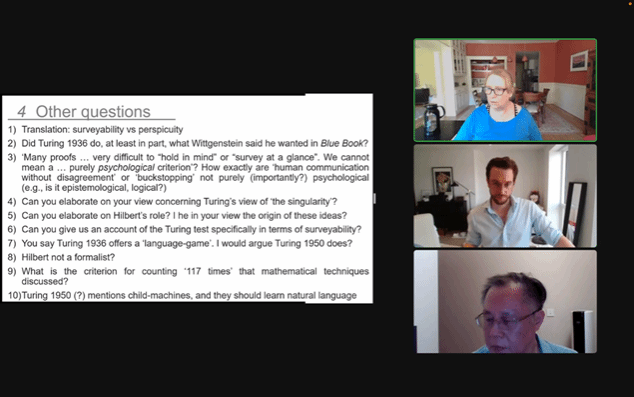 本网讯(通讯员李懿迪)9月6日晚,应海角网 陈波教授邀请,美国波士顿大学哲学系讲座教授、波士顿大学人文中心主任、国际科学哲海角网 (AIPS)通讯院士朱丽叶·弗洛依德(Juliet Floyd)做了题为“维特根斯坦、图灵和可检测性(Wittgenstein, Turing, and Surveyability)的线上讲座,它属于新设立的“海角网 科学技术哲学论坛”第一讲。讲座由陈波主持,北京大学哲学系助理教授王小塞(Sebastian Sunday Greve)评议。来自国内外的400余名听众参与本次线上讲座。