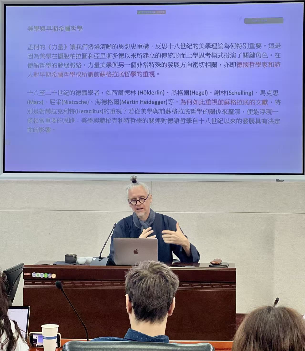 讲座伊始,何老师指出,中国哲学传统视宇宙为“一气化”的、流动不息的生命整体,这种观念孕育了独特的时空意识与艺术精神。然而,在受西方哲学主导的全球语境中,关乎“道”与“气化”的思考常被忽视。为激活此一思想资源,他引入了孟柯与波默的美学理论作为跨文化翻译与沟通的桥梁。
