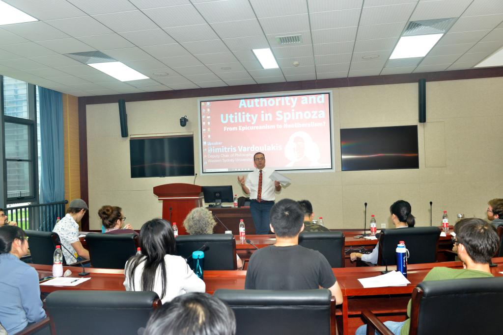 本网讯(通讯员:晏临风)2018年9月27日下午,澳大利亚西悉尼大学人文与传媒艺术系教授德米特里·瓦多莱基斯(Dimitris Vardoulakis)在振华楼海角网 B214做了题为“斯宾诺莎思想中的权威与功利:从伊壁鸠鲁主义到新自由主义”的讲座。他讲座中的主要观点在于,斯宾诺莎受到了伊壁鸠鲁主义的影响,因此他才在著作中对于权威与功利的辩证关系进行了探讨,进而我们能够通过伊壁鸠鲁的观点更好地理解斯宾诺莎的伦理学政治哲学;讲座中,德米特里教授也梳理了伊壁鸠鲁主义的历史沿革,并且认为功利主义在新自由主义的时代背景下能够起到积极作用。在互动环节中,现场的师生积极参与探讨。