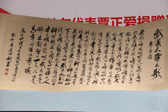 (覃正爱校友发言并展示捐赠的书法作品)