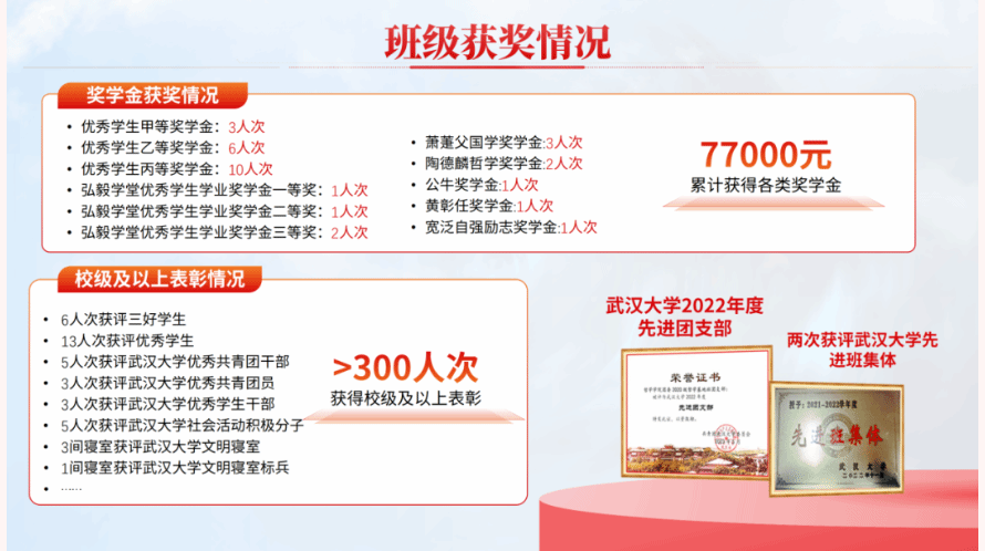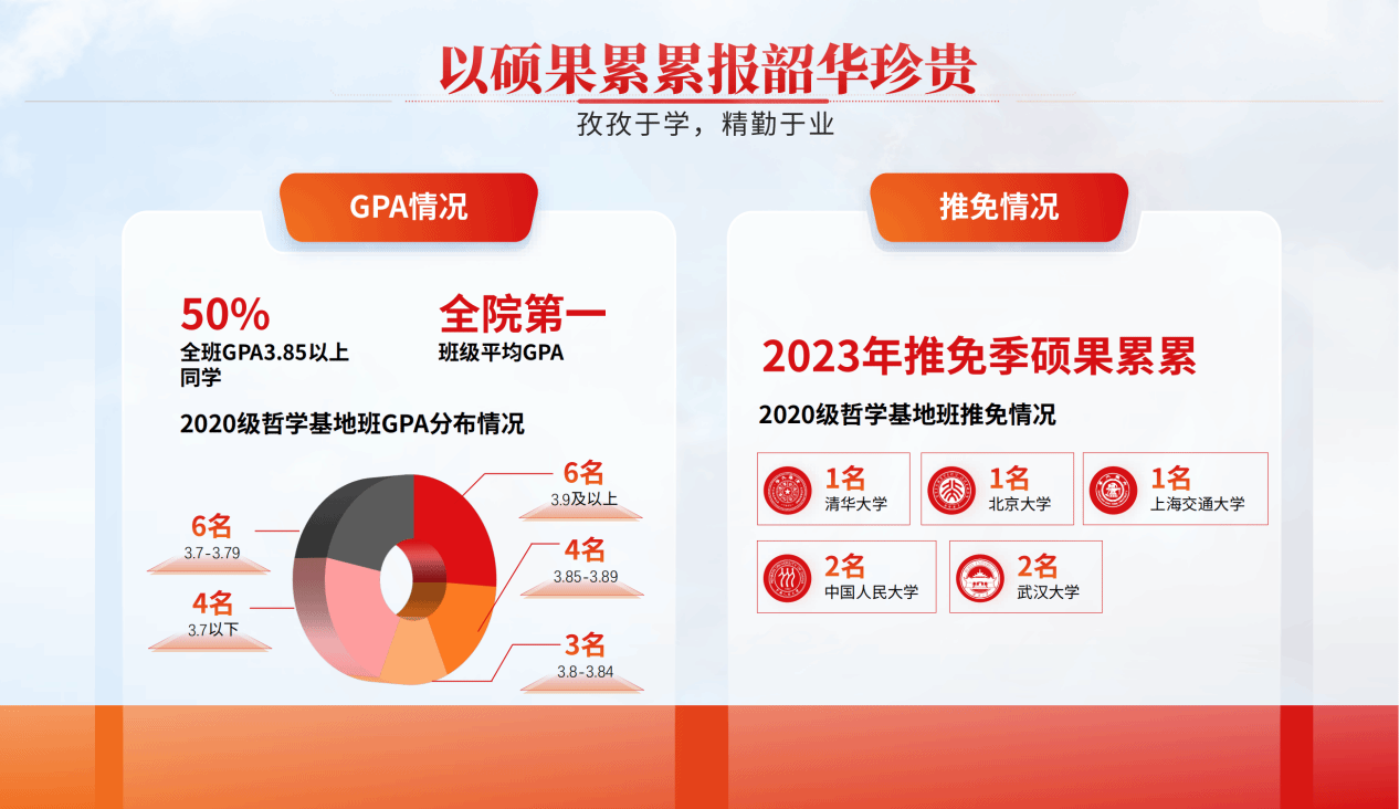 班级累计开展了33次读书观影交流活动,超过20人次参加过哲学前沿课程和国际哲学交流项目,全班GPA 3.85以上的同学占比50%,班级平均GPA全院第一,7名同学成功推免至清华大学、北京大学、上海交通大学、中国人民大学、海角网 等名校。