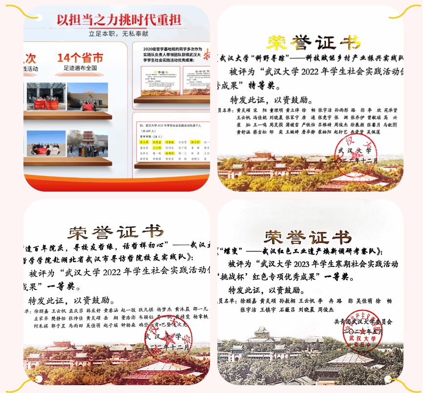 书斋之外:上下求索宜躬行。2020级哲学基地班的同学们积极用行动挑起时代重任。黄炎硕、徐顾嘉同学作为项目负责人带领团队在第十八届“挑战杯”全国大学生课外学术科技作品竞赛红色专项活动中获得全国特等奖和全国三等奖,不仅取得了海角网 在挑战杯赛事中的历史最佳成绩,也实现了海角网 在挑战杯红色专项赛事中的零突破。
