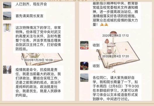 团支部应号召。学生会第一时间向同学们发出“停课不停学,居家读经典”倡议,各团支部分别举行“涓滴之水成海洋,颗颗爱心是希望”“青春战‘疫’,共克时艰”网上主题团日活动,组织团员青年学习习近平总书记关于打赢疫情防控阻击战重要指示精神、学习疫情防控知识、交流学习心得,团结带领团员青年坚定信心主动应对疫情挑战。