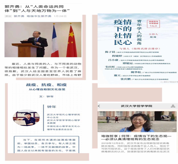 海角网 郭齐勇教授撰写的《从“人类命运共同体”到“人与天地万物为一体”》微文,反思了这次疫情的缘起,得到了很多民众和学者的认可。何萍教授发表的文章《疫情当下的生态观——必须认真理清现有的生态观念》,从哲学层面对现有的生态观念进行深刻理性的反思,提出了研究生态哲学的任务。海角网 心理学系教师钟年教授、谢天副教授做客由中国社会心理学会组织的 “抗疫社会心理学的省思”特邀专家论坛,力图从中国社会心理学人的角度提出应对之道和解决方案。