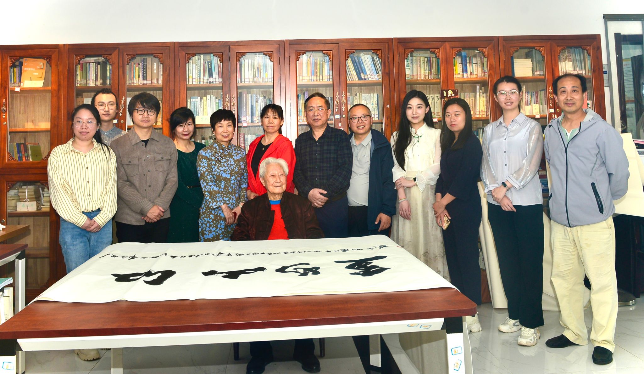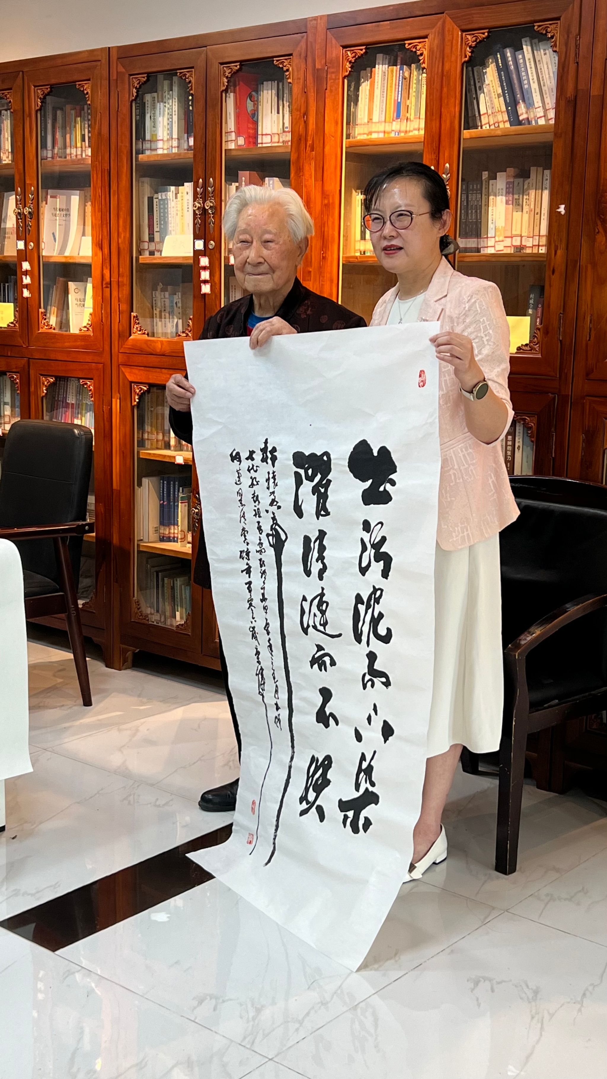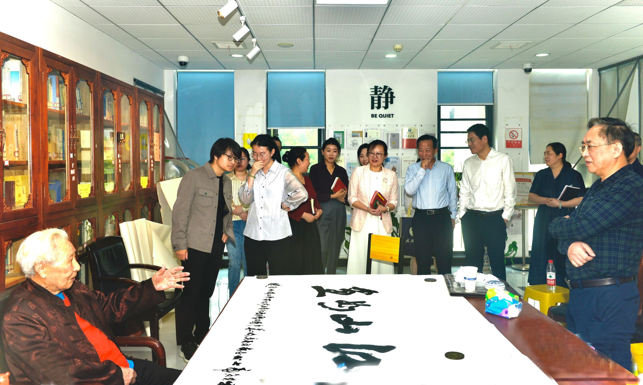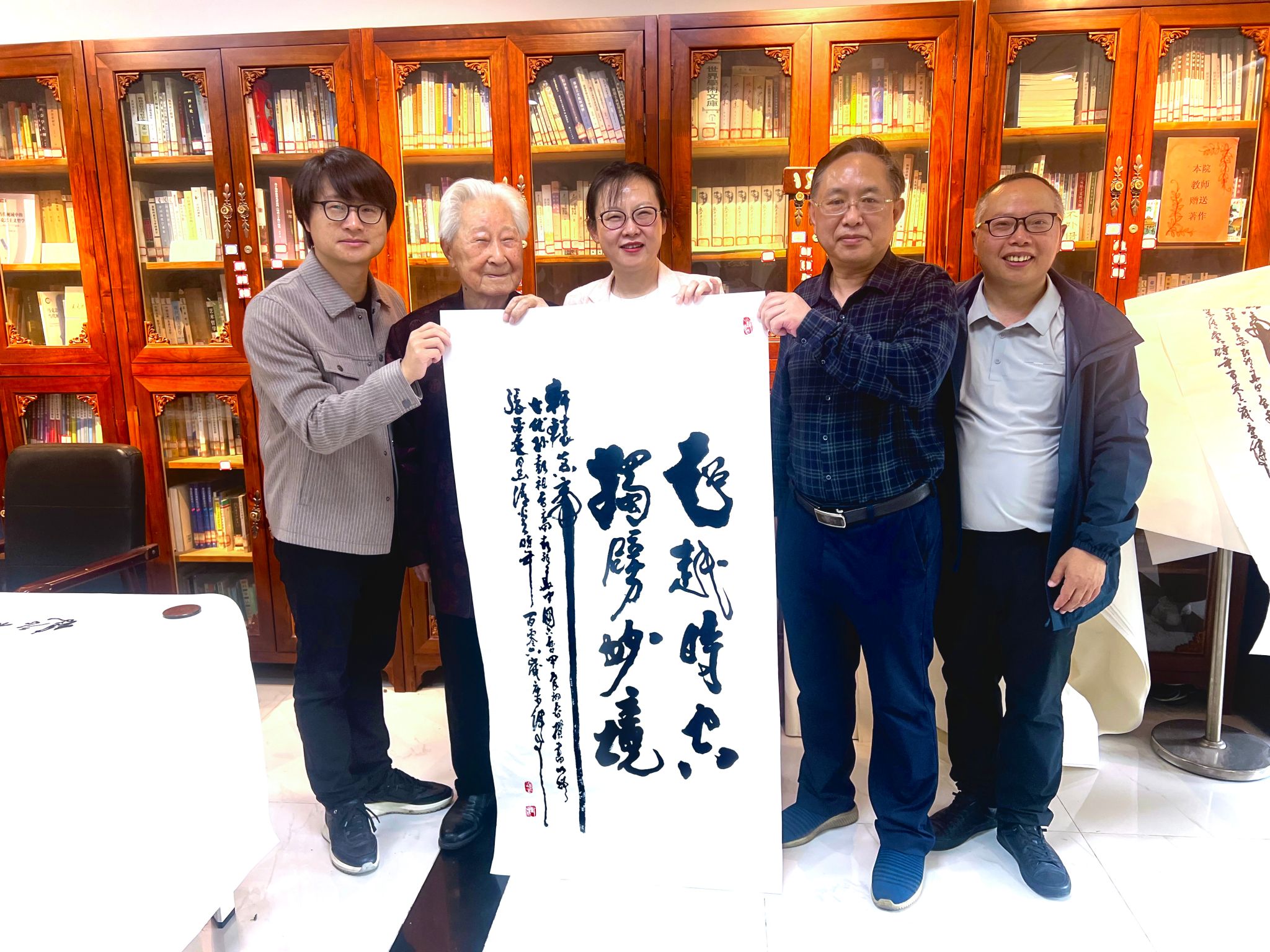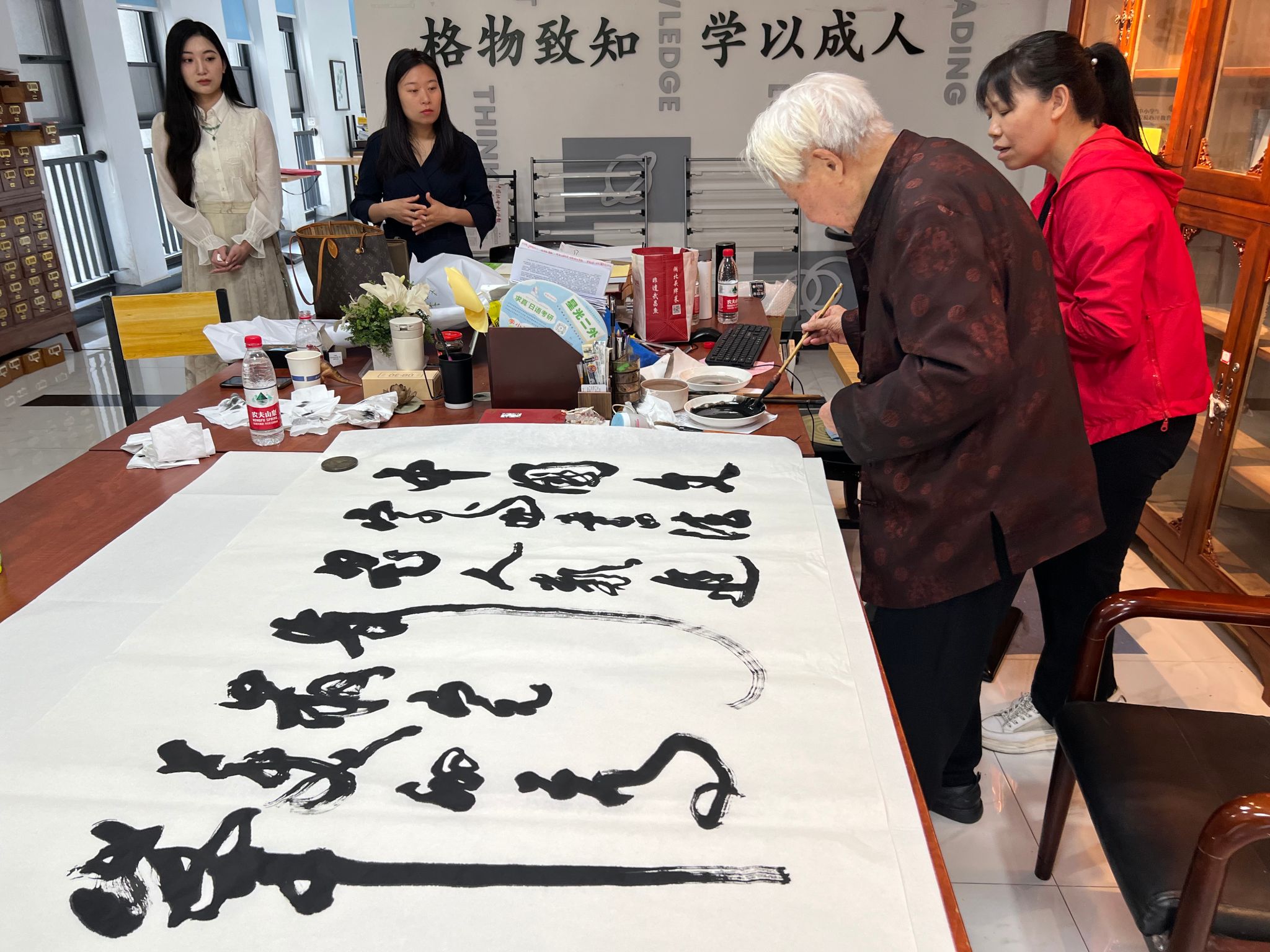 活动现场,百岁高龄的彭老先生气定神闲,运笔如飞,在挥毫泼墨间,笔走龙蛇,疏密有致,以精湛的书法技艺,现场写作了“江山如画”、“美学空间”、“中国文字与书法是人类进步最完美的高峰”等多幅书法作品,并在创作过程中现场讲解书法创作要领,为在场师生呈现了一场生动而丰富的艺术与美学盛宴。