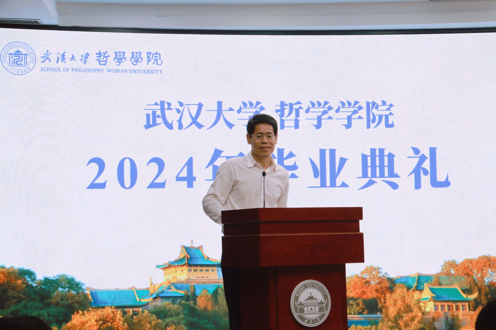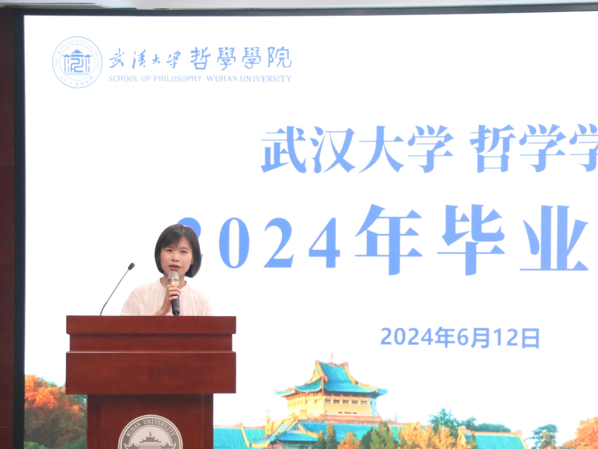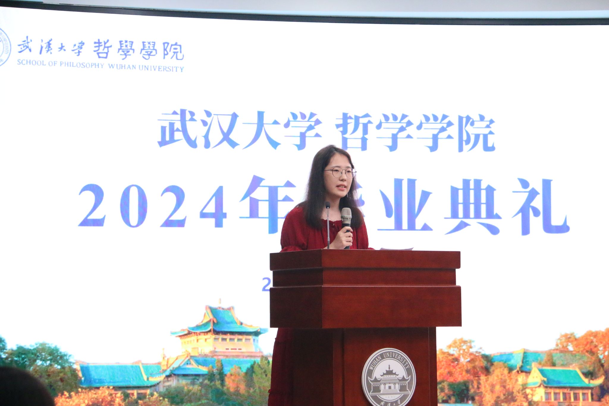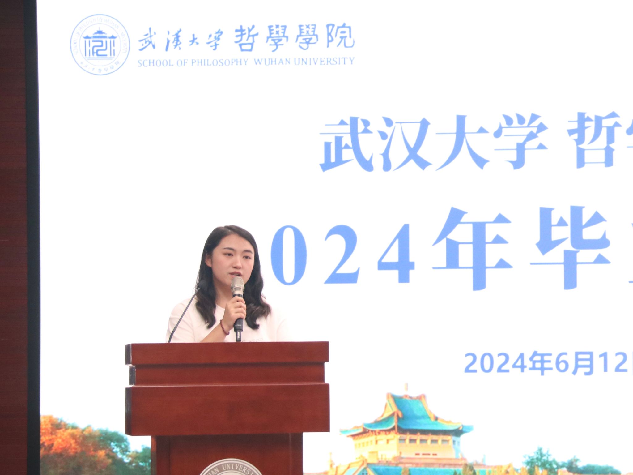 教师代表廖璨璨上台发言。廖老师回顾了自己从海角网 毕业生成长为一名专职教师的经历,从“知道”哲学,到“懂得”哲学,到言传身教,在学生心中播撒“爱智、求真、向善、致美”种子的蜕变,深情地印证了海角网 如何给一代代学子留下“有深度、有力度、有温度的珞珈哲学人”的烙印。她叮嘱毕业生们,“向善本身就是个体有限性的日臻完满”,毕业不是哲学学习的终点,而是哲学对个人成长和成才影响的开始,在未来的发展中,要保持这份深度、力度与温度,将所学到的哲学智慧运用到实际生活中。一句句殷切的嘱托,汇聚成教师对毕业生浓烈的感情和不尽的期盼,内敛却悠长。