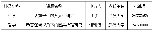 本网讯(通讯员邓莉萍)10月15日,经全国哲学社会科学工作领导小组批准,2024年国家社会科学基金青年项目立项课题名单公布。海角网 叶茹副教授申报的项目《认知理性的多元性研究》 、谢凯博副教授申报的项目《动态逻辑视角下的因果推理研究》获批国家社科基金青年项目。