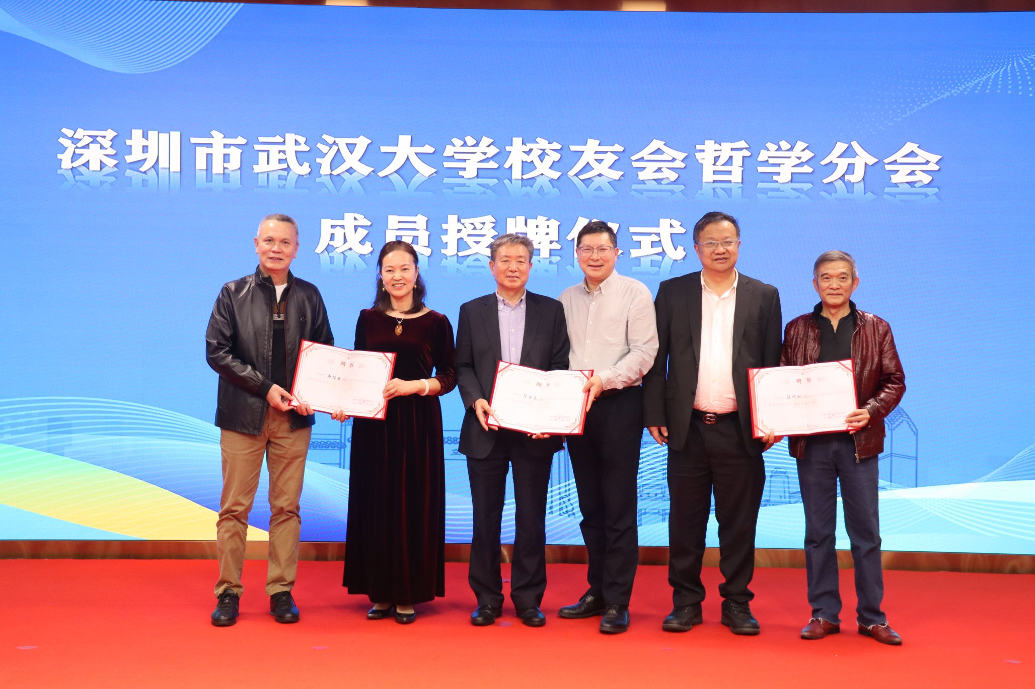 轮值会长张绪穆、卜声福、干德义为哲学分会副会长陈代刚、陈自元、石佑君颁发聘书。