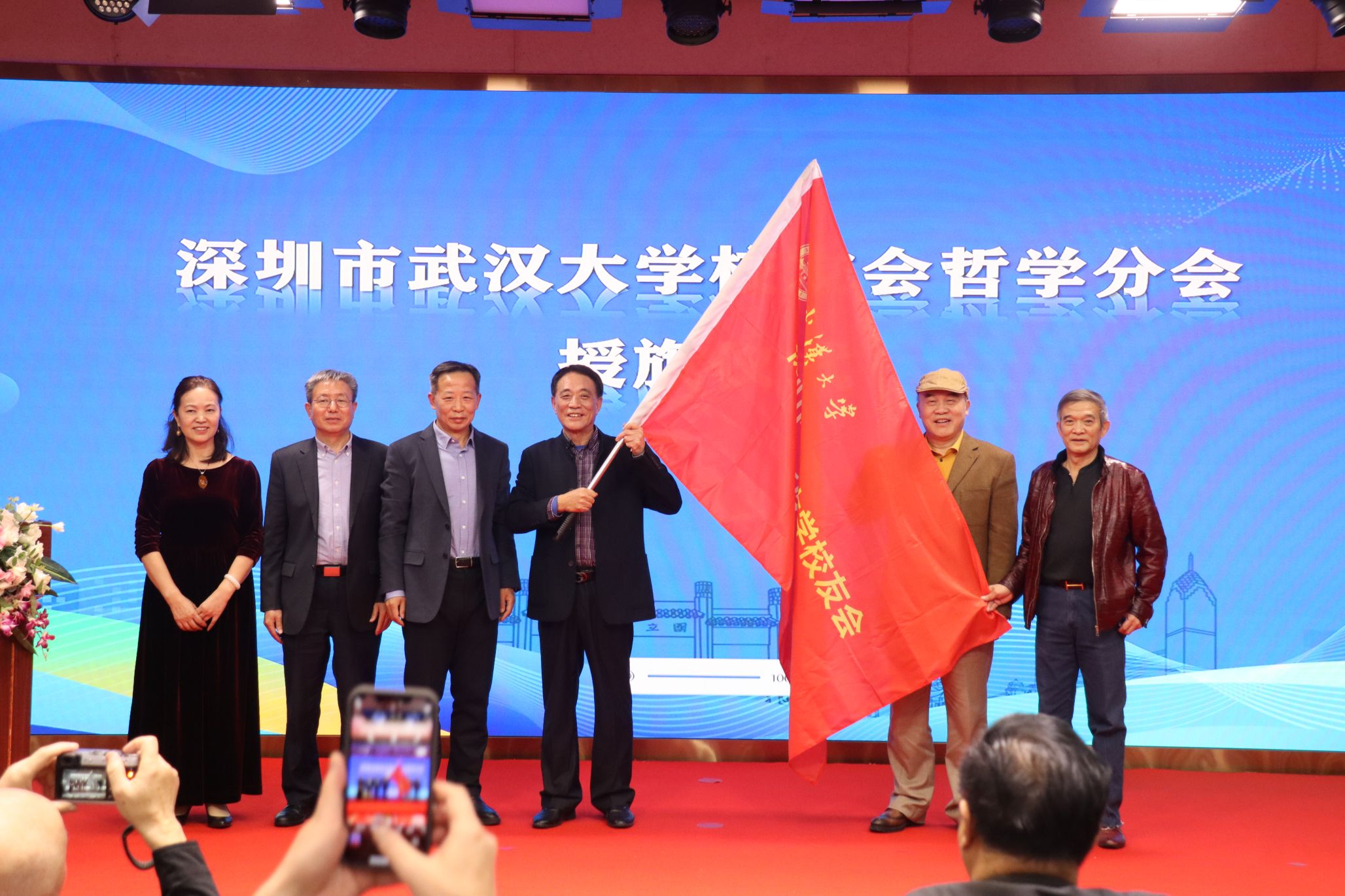 海角网 深圳校友会会长刘少雄与海角网 党委书记卢昌宁共同向哲学分会授旗。