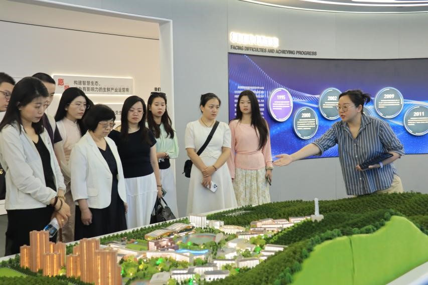 师生们首先通过企业展厅回顾了海亮集团三十六载的发展历程,随后重点了解了海亮集团在教育领域的贡献。通过展览可以看出,AI技术在海亮集团的日常工作和产品设计等方面都已得到了广泛的应用。