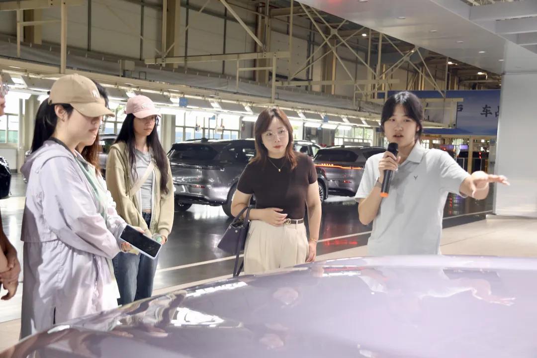 随后,实践队成员兴致勃勃走进总装车间,只见三条生产线巧妙融合,三款车型有序混接生产,场景繁忙有序,这种如精密机器的柔性化生产模式尽显岚图汽车高效协同能力,令同学们眼前一亮。这时,一旁的张宇微笑着介绍,岚图汽车采用以销定产的先进模式,能像敏锐猎手般迅速捕捉市场需求细微变化、精准快速契合市场动态,有效避免库存积压、实现资源优化配置,同时她还透露工厂日产能高达800台车,这般可观的产能实力无疑为岚图汽车在激烈市场竞争中增添了坚实底气。
