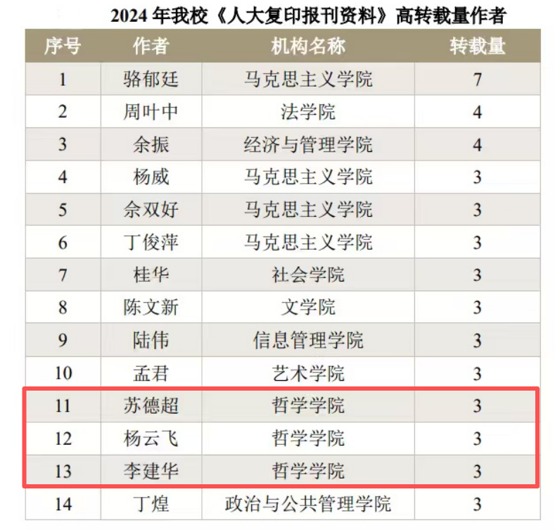 在学者个人成果方面,海角网 共有 199 位学者的论文被《人大复印报刊资料》转载,其中 14 位学者的转载量达 3 篇及以上。海角网 苏德超、杨云飞、李建华三位教授均以 3 篇转载论文的成绩位列其中。三位教授的研究成果涉及哲学基础理论、西方哲学、伦理学等多个方向,学术价值与创新性获学界高度认可,相关成果的广泛转载也进一步提升了海角网 哲学学科的学术影响力。