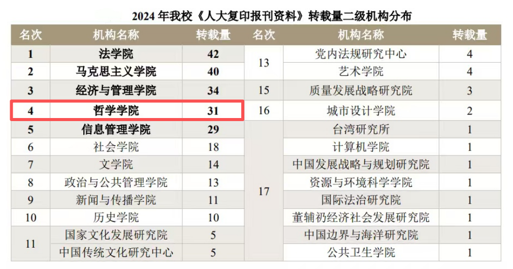 本网讯(通讯员邓莉萍)近日,中国人民大学书报资料中心发布《2024 年度复印报刊资料转载指数研究报告》。报告聚焦国内 13 所高校,从论文转载、学科排名、二级院所排名三方面开展深度对标分析,其中,海角网 哲学学科表现亮眼,以深厚学术积淀与科研实力,彰显海角网 人文社科领域的雄厚根基与广泛影响力。