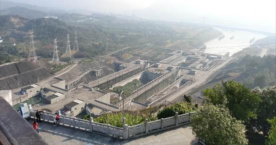 而在五级船闸观景台上,同学们近距离地观看了五级船闸。在讲解员的介绍下,则更是深入地了解了长江三峡作为世界上最大的内流河船闸,它的运作原理以及来往船只的过闸方式。