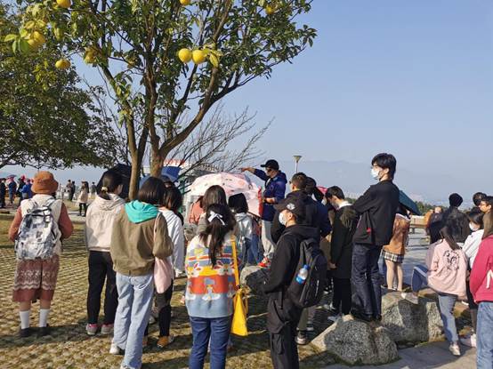 最后,同学们来到了截流纪念园。在园中陆续参观了石料仓、地下廊道入口和截流记事墙,并在最佳观坝广场上从仰视角度观览三峡大坝。和缓的江水仿佛是静止的油画,与远处的蓝天融为一体,同学们可谓是切身体验了王勃笔下“秋水共长天一色”的意境之美。