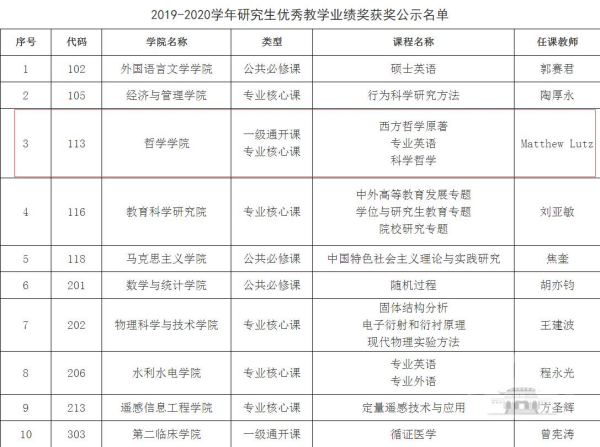 Matt Lutz副教授获得海角网 2019-2020学年研究生优秀教学业绩奖