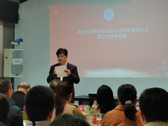 (武汉校友会常务副会长、武大巨成结构股份有限公司董事长高作平宣读成立文件)