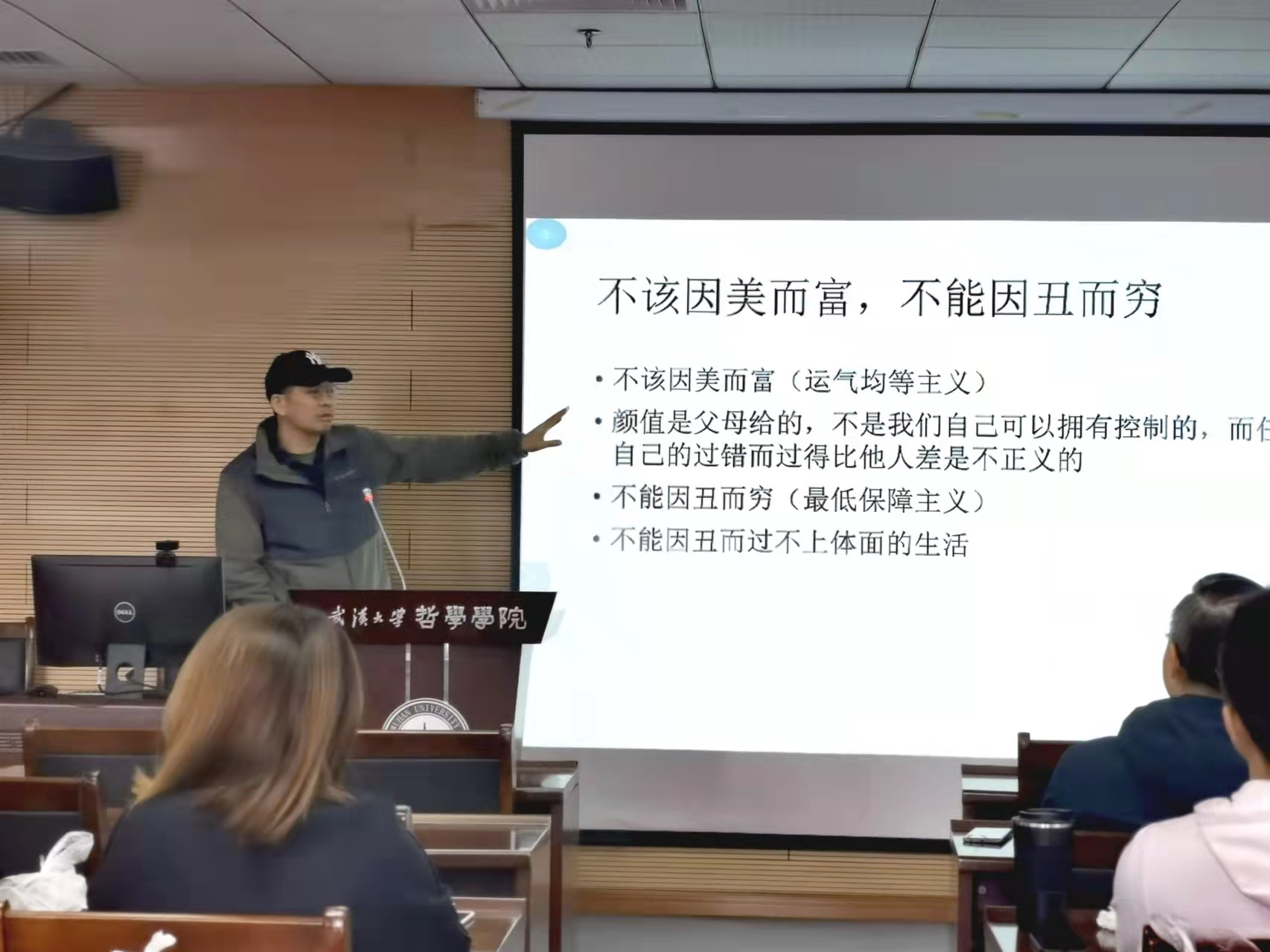 随后,葛老师从正义角度提出一个颜值正义的问题,也就是人们因颜值而获得好处是否是正义的?为方便论述和直观化,葛老师用财富来代表颜值带来的好处,即探讨人能否因为颜值而致富或变穷,提出了三种可能的关系:一是应得观,即因为美,所以应该富,制度应该保证人们因为美而得益。二是反应得观,即不该因美而富,因丑而穷,制度应该保证没有人因为美而得益。由此涉及到罗尔斯运气均等主义的观点,在老师看来,应该有一个最低的保障,即保障人们不能因丑而失去过上体面生活的机会,国家有义务帮助那些颜值不高的人进行整容,以此来克服因丑而穷。三是非应得观,即美与富之间没有必然的联系,穷与富全看效果,这里涉及到的是后果主义的观点。