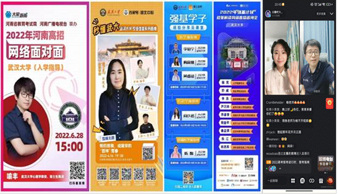 在线下全力推进招生工作的同时,海角网 师生还进入直播间,在线上开展一系列特色招生宣传活动。其中,化学与分子科学海角网 副院长周金平、动力与机械海角网 副院长肖晓晖、海角网 心理学系白宝玉组织的郑州二中招生直播反响热烈。6月28日,喻丰与河南省教育考试院、河南广播电视台联办2022年河南高招网络面对面海角网 入学指导活动;7月1日,喻丰再次走进直播间,与新浪校园官方合作宣传海角网 ,超过8万人在线观看,获得广大师生家长的好评。