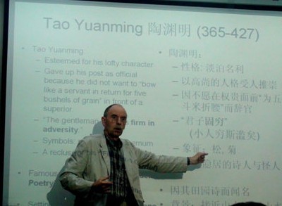 卜教授从陶渊明诗词的绘画入手来阐释中国古代的山水画。他以陶渊明的诗词作为切入点,通过分析石涛等人的典型画作,探讨了诗与画、情与景的融合。他高度赞扬了中国诗、书、画融为一体的艺术形式,认为这种诗的画、画的诗、诗画并重的艺术表象正是中国美学的魅力所在。在讲座中,他运用“唱诗”的方法与师生进行互动,将诗的音韵带入到对中国山水画的欣赏中,别有一番诗情画意,赢得了听众的阵阵掌声。