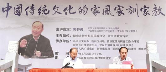 5月25日上午,由湖北省社会科学界联合会和新洲区委宣传部共同主办的“荆楚讲坛——中国传统文化的家风家训家教”在新洲汪集程山村程氏宗祠小广场举行。海角网 国海角网 院长郭齐勇主讲,程山村及周边村民500多人聆听了讲座。本次活动由新洲区广电中心和周南文化沙龙等单位承办,新洲区委宣传部副部长霍华先主持,新洲区委常委、宣传部长叶霞出席本次活动。