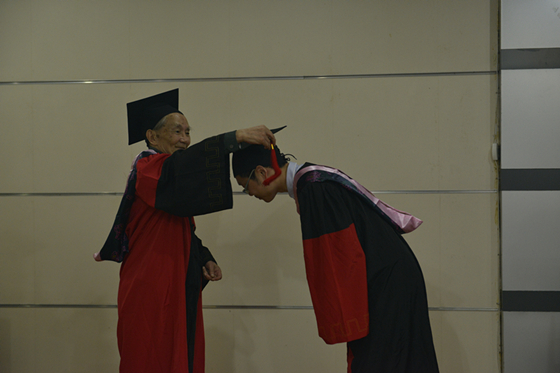 毕业典礼后举行了学位授予仪式。院党委副书记徐萍、龚文德先后宣读了授予学位的研究生、本科生名单。刘纲纪、郭齐勇等教师代表先后登台,为毕业生授予学位证书、拨正流苏,并合影留念。