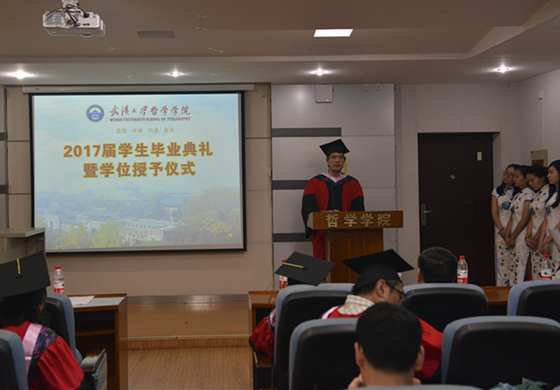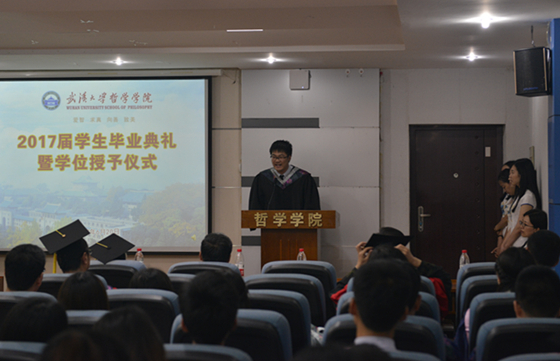 “离别并不总是感伤的,正如成熟的稻谷离开生育的大地,回归粮仓;又如金黄的种子离开播撒之手,回到大地。前者既是农人收获喜悦的季节,又是稻谷将实现自己本性的开始;后者是种子获得生长的机遇,又是播种者收获希望之时。”院长吴根友教授发表了热情洋溢的讲话。他送给同学们四句祝福:毕业是新的学习征程的开始;保持哲学人的反思精神与思考习惯,过一种有省察的生活;做一个既有情怀,又有胸怀的珞珈哲学人;专业从来不能定义你们的人生,你们恰恰要用自己的人生去重新定义、诠释自己的专业。他说,在未来的岁月里,无论你们取得多大的成就,或者仅仅是成为一个健康而平凡的建设者,我们都将以迎接我们尊贵的校友的态度,在新的振华楼里迎接你们的归来。