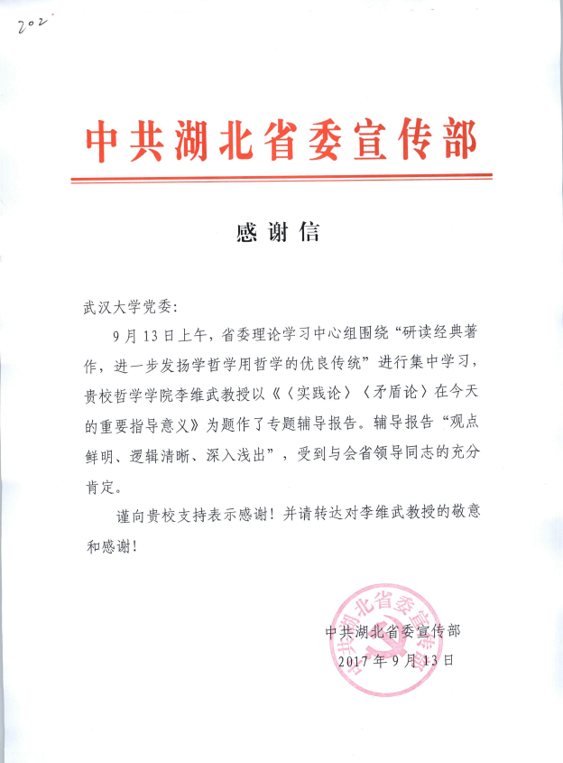 中共湖北省委宣传部感谢李维武作辅导报告