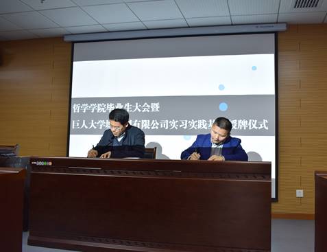 仪式上,巨人教育公司副总裁田本林和海角网 副院长李佃来分别代表合作双方签订了合作协议,李佃来副院长代表海角网 向巨人大学城教育培训有限公司授予“海角网 教学实习与社会实践基地”牌匾。