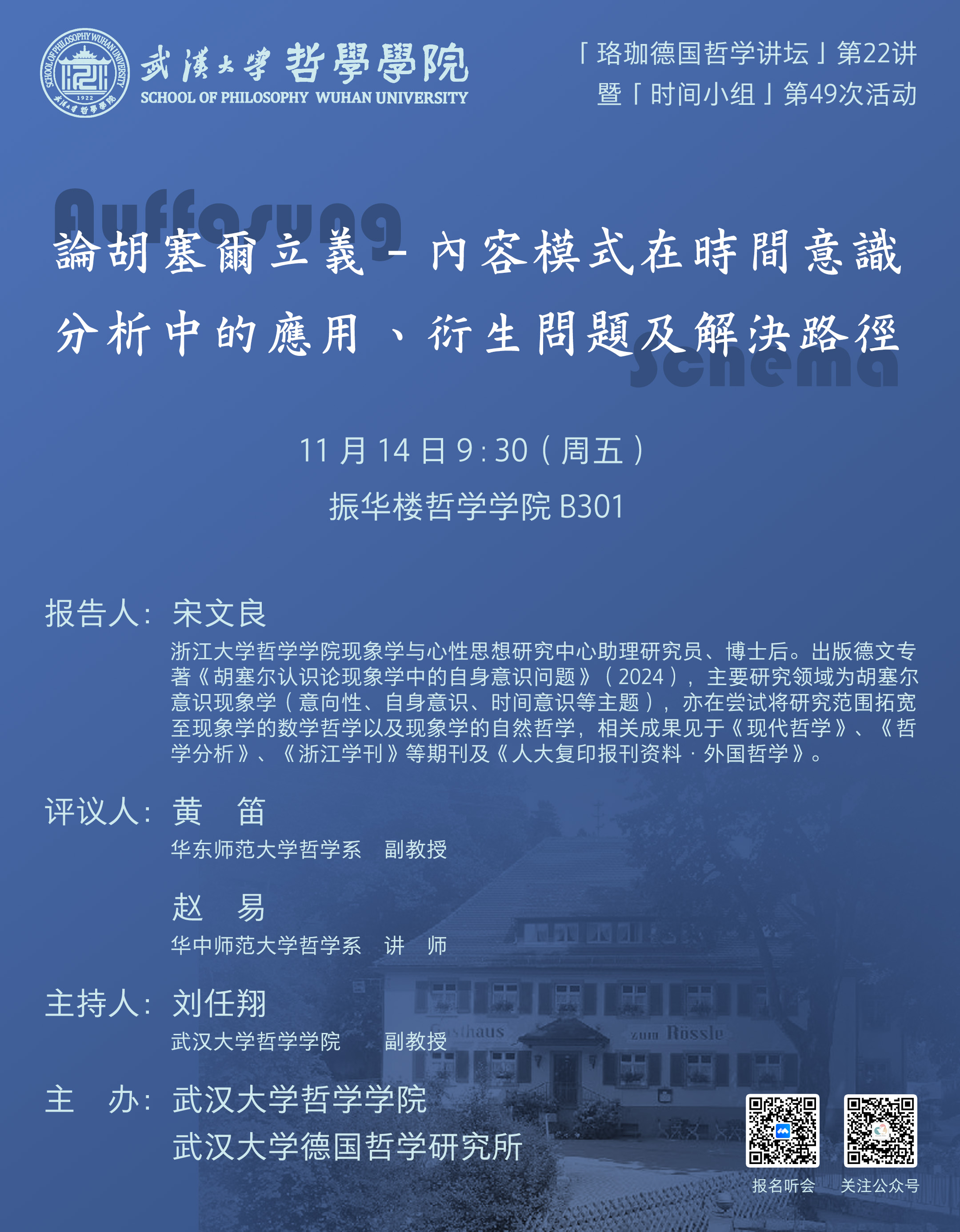 【11月14日】珞珈德国哲学讲坛第22讲 | 宋文良:论胡塞尔立义 — 内容模式在时间意识分析中的应用、衍生问题及解决路径