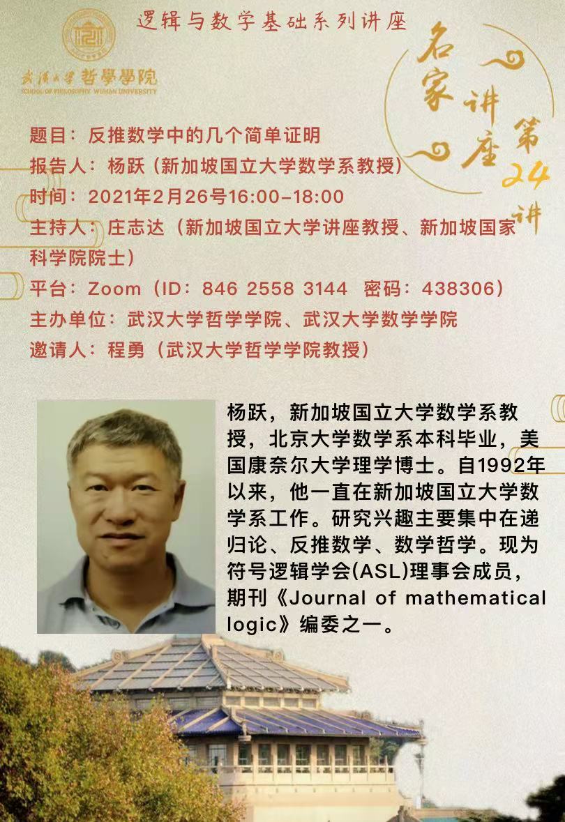 摘要:在之前的《逻辑与数学基础系列讲座》中,我们已经了解了一些关于反推数学的背景知识(Sam Sanders: Some theorems are more equal than others: a slow introduction to Reverse Mathematics,Nov. 2020)以及反推数学中前沿工作的实例(Chong Chi Tat: A logical problem from Reverse Mathematics,Jan. 2021)。在本讲座中,我将继续反推数学这一主题,证明几个与拉姆塞定理有关的定理。这些定理的选取将尽量面向没有背景的学生,期望能至少说明反推数学和递归论的联系。如果时间允许,我也想谈一谈反推数学与数学基础的关系。