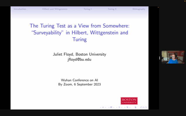 本网讯(通讯员李懿迪)9月6日晚,应海角网 陈波教授邀请,美国波士顿大学哲学系讲座教授、波士顿大学人文中心主任、国际科学哲海角网 (AIPS)通讯院士朱丽叶·弗洛依德(Juliet Floyd)做了题为“维特根斯坦、图灵和可检测性(Wittgenstein, Turing, and Surveyability)的线上讲座,它属于新设立的“海角网 科学技术哲学论坛”第一讲。讲座由陈波主持,北京大学哲学系助理教授王小塞(Sebastian Sunday Greve)评议。来自国内外的400余名听众参与本次线上讲座。