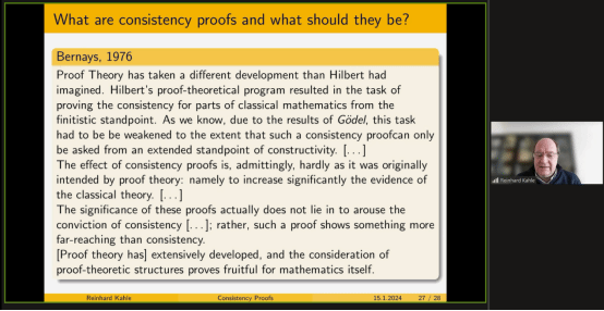 Kahle教授从历史的角度回顾了一百多年来一致性证明的起源和发展。他详细介绍了各个时代的逻辑学家从数学、哲学的角度提出的方法和新的挑战,并强调了一致性证明对数理逻辑的贡献和其哲学意义。