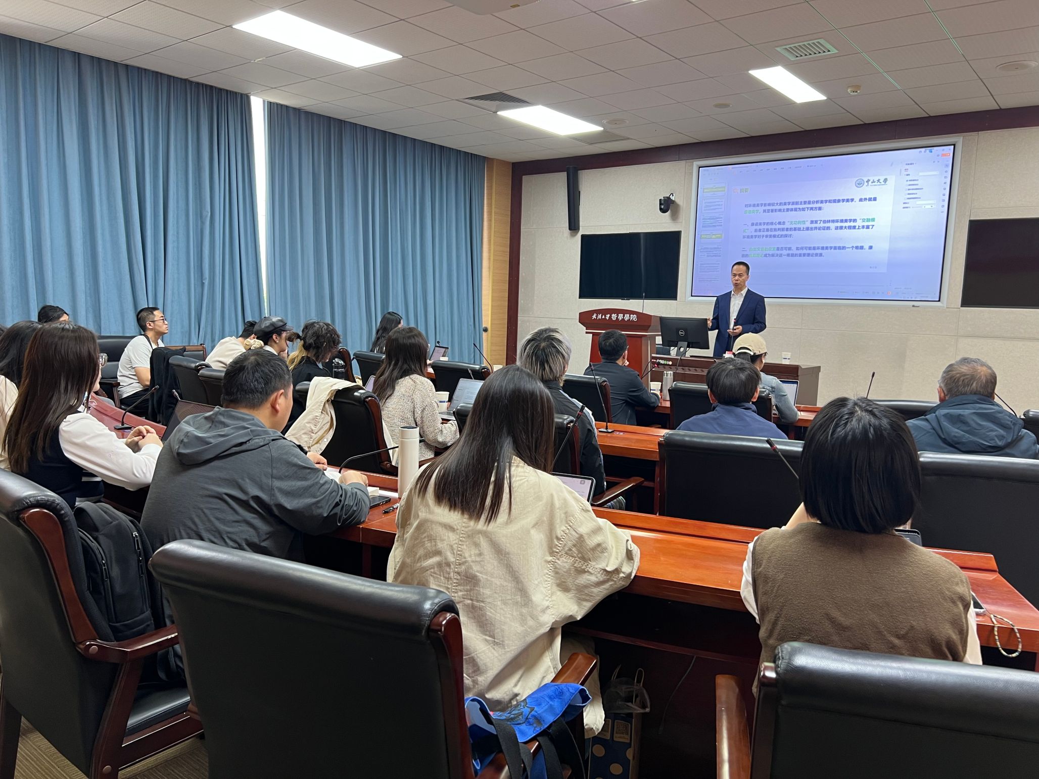 互动环节中,程相占教授就外国哲学教研室王咏诗副教授等在场师生提出的“康德的‘主观目的’提法与‘如其本然地欣赏自然’之间是否存在张力?”、“审美距离论是否适于刻画柏林特的‘参融理论’?”、“如何理解康德意义上的‘天人合一’?”、“‘无利害’与柏林特对审美的文化性维度的强调是否存在张力?”、“如何通过环境美学应对‘否定美学’?”等问题,与在场师生进行了深入交流。