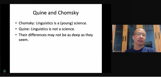 在评议环节,李大强总结了讲座内容并充分肯定了讲演内容的丰富性,并提出如下问题:蒯因哲学显著特征在于其与日常经验的疏离性:其所用案例多为理想化建构,脱离现实生活语境,如此蒯因哲学如何能与我们的现实生活建立有效连结?蒯因想令其理论达到何种客观程度?以及蒯因本人是否对现实世界(real world)感兴趣?