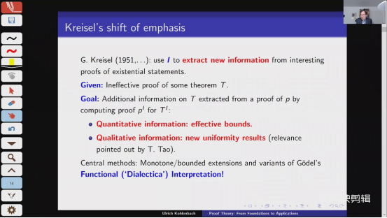 2021年3月9日下午4点,逻辑与数学基础系列讲座第15讲由德国达姆施塔特工业大学数学系Ulrich Kohlenbach教授线上主讲,报告题目是“证明论:从数学基础到核心数学中的应用”。海角网 程勇教授主持,英国巴斯大学计算机科学系Thomas Powell博士、德国波鸿鲁尔大学哲学系Sam Sanders博士、杭州电子科技大学数学系徐洪坤教授担任与谈人。讲座由伟大的Hilbert计划出发,讲到Kreisel的开创性思想。Kreisel将证明论的重点从仅仅是数学理论的一致性问题转移到这样一个问题上:“如果我们用有限的方法证明了一个定理,除了知道它是真的,我们还能知道什么?”在此基础上,Ulrich Kohlenbach引出了本次讲座的核心内容:证明挖掘。紧接着,Ulrich Kohlenbach概述了证明挖掘在核心数学中的应用。在过去的20年里,使用证明挖掘方法人们在如下领域已发现大量新的定量结果和定性结果:非线性分析,不动点理论,遍历理论,拓扑动力学,逼近理论,凸优化,抽象柯西问题,追踪-回避博弈。Ulrich Kohlenbach介绍了证明挖掘的应用基础,如何将一个给定的证明翻译成一个新的证明使得新证明是基于直觉主义逻辑,同时还使用了理想的元素。讲座的最后,Ulrich Kohlenbach从凸优化、追踪-逃避博弈、遍历理论三个方面,具体讲解了证明挖掘在核心数学中的应用。