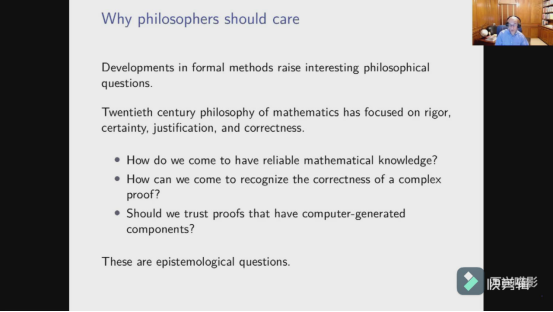 2021年4月7日上午9:30,逻辑与数学基础系列讲座第17讲由美国卡内基梅隆大学哲学系、数学系Jeremy Avigad教授线上主讲,报告题目是:“交互式定理证明与Lean定理证明器”。海角网 程勇教授主持,上海交通大学John Hopcroft计算机科学中心曹钦翔助理教授、 中国科海角网 软件研究所詹博华副研究员、北京大学哲学系王彦晶教授参加与谈。讲座伊始,Jeremy Avigad对交互式定理证明进行了简要的概述。借助于计算机证明助理,数学在实践中是可以形式化的。 使用这样的证明助理,用户可以构造一个形式化的公理证明。在许多系统中,这个证明对象可以单独提取和验证。紧接着,讲座针对三类人群——数学家、逻辑学家、哲学家来探讨为什么他们要关注这一领域。对于数学家,形式化证明助理是种可以帮助我们更好地做数学的工具。对于逻辑学家,形式化方法依赖于诸多逻辑学中的经典结果。对于哲学家,形式化方法的发展提出了一些有趣的哲学问题。讲座的最后,Jeremy Avigad介绍了一个特定的定理证明器——Lean,越来越多的数学家开始使用它,并做出一些重要的成果。