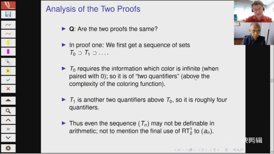 2021年2月26日下午4点,逻辑与数学基础系列讲座第14讲由新加坡国立大学数学系杨跃教授线上主讲,报告题目是:“Ramsey定理,反推数学及数学基础”。新加坡国立大学讲座教授、新加坡国家科海角网 庄志达院士主持。此讲座的内容大致可以分为三个部分。第一个部分是预备知识。杨跃教授从可计算性角度出发分别引入可计算集和一阶算术可定义集。在反推数学中,这两类集合分别对应递归论中RCA0和ACA0两个算术子系统。讲座的第二部分是证明反推数学中的几个定理。在证明Ramsey定理的过程中,杨跃教授运用了两种方法,一种通过不断提纯尾巴,另一种运用了二叉树的思想。讲座的第三部分是对数学哲学的讨论,主要涉及三个观察。第一个观察是绝对混沌是不可能的。第二个观察是数学问题的解比数学问题本身层次更高。第三个观察是秩序是真实存在的,我们要不断提升自己才能观察到这些秩序。