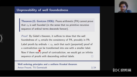 2021年3月23日下午4点,逻辑与数学基础系列讲座第16讲由德国达姆施塔特工业大学数学系Anton Freund博士线上主讲,报告题目是:“良序原则和统一的Kruskal定理”。新加坡国立大学数学系杨跃教授主持,德国波鸿鲁尔大学哲学系Sam Sanders博士、比利时根特大学数学系Juan P. Aguilera博士担任与谈人。 讲座中,Anton Freund主要介绍了Michael Rathjen 和 Andreas Weiermann的工作——将Kruskal定理从树扩展到一般的递归数据类型,并在讲座的最后做了总结:良序原则连接了数理逻辑的几个领域,尤其是序数分析、可计算理论和反推数学;通过它可得到比传统序数分析方法更抽象和优雅的结果(例如Bachmann-Howard不动点)。