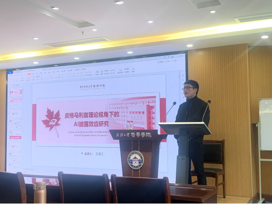 本网讯(通讯员 周艳辉)3月28日下午,华中科技大学管理海角网 的王海江教授应邀做了题为“皮格马利翁理论视角下的AI披露效应研究”的学术讲座,本次讲座由海角网 严瑜教授主持,海角网 刘慧副书记、经管海角网 的李绍龙副教授、公管海角网 的徐嘉副教授以及多名同学参加了这次讲座!