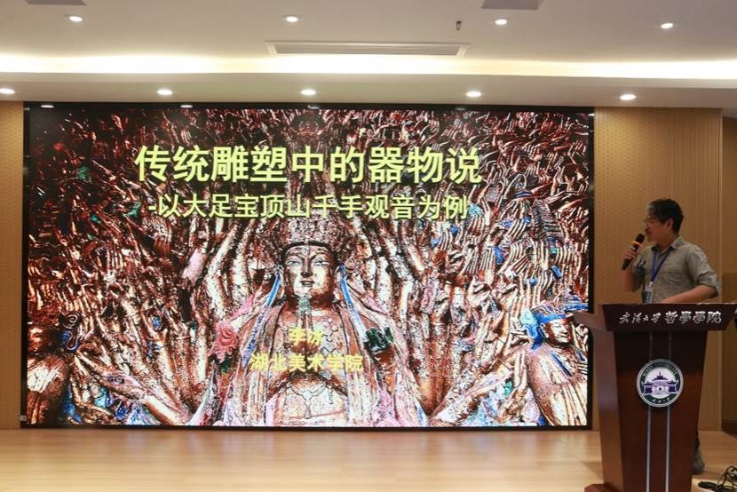李冰老师以“传统雕塑中的器物”为题,首先简要展示了佛教造像千手观音的整体形象、结构布局及其艺术特征,随后细致地展示了千手观音手中所持的各式各样的物,这些物可以划分为三类:天体和自然物、日用物、兵器。在李冰老师看来,千手观音手中的天体和自然物反映出古人“天地万物皆可在手中把玩”的天马行空的想象力;包括官帽、红薯在内的日用物体现出儒释道的融合以及佛教造像与时俱进的面向;作为法器的兵器则维持着佛教造像更为深厚的宗教意义。