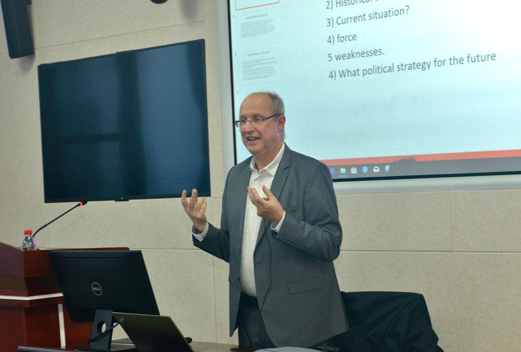 Jean-Michel DE WAELE教授在讲座中界定了“激进左派”在欧洲语境中的内涵,回顾了20世纪七八十年代以来特别是1989年柏林墙倒塌和1991年苏联解体以来欧洲左翼运动的衰落,着重阐述了2008年全球性经济危机以来激进左派在欧洲各主要国家兴起的背景、原因和具体表现,探讨了欧洲激进左派面临的问题以及可能的解决途径。