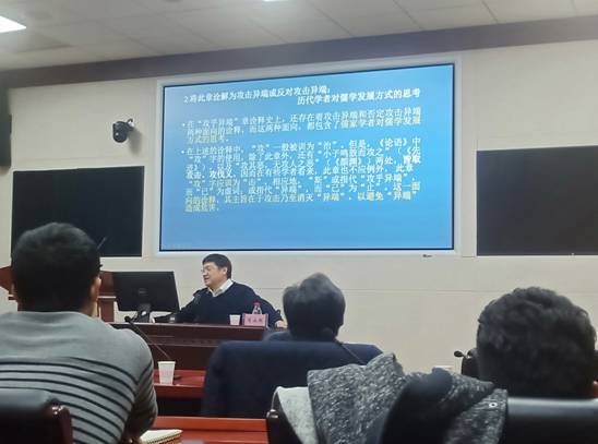 随后,肖永明教授列举阐述了历代学者对《论语》“攻乎异端”章的诠释及其儒学建构。他认为,自汉代以来,这些诠释大致分为三类:一是认为学习、专攻异端是有害的;二是认为应攻击消灭异端以避免异端之害;三是认为攻击异端是有害的,主张昌明儒学则异端自不能为害。肖教授从历代“异端”内涵的变化考察儒学的演进,以及历代学者对儒学发展方式的思考。