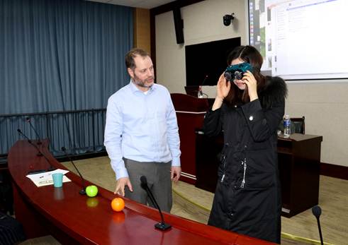 讲座的第二部分是实验参与环节。与会同学在Sumner教授的带领下体验了VR虚拟眼镜,随后佩戴用于视觉适应实验的视觉错位眼镜,体验了视觉系统变化给我们带来的神奇视觉感受。同学们跃跃欲试,纷纷上台感受,现场气氛非常热烈融洽。