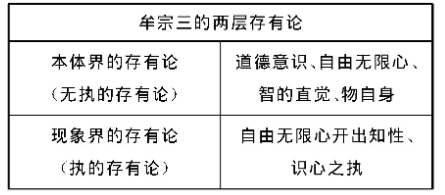 牟宗三立足其道德形上学,发展出其“两层存有论”。牟氏以康德的现象与物自身的区分为思考背景,指出这种区分属于超越的区分,可与中国哲学会通。但是,康德因为不将物自身视作价值概念,而视作事实概念,因此弱化了物自身对于现象的超越性意义,使得他的这种超越区分受到动摇。同时,康德哲学中,与物自身层面相关的上帝存在、灵魂不朽、自由意识这三个预设,也晦暗不明。据此,牟宗三揭示出现象与物自身之分可引申为现象界的存有论与本体界的存有论二层,由此而成两层存有论。本体界的存有论通过“智的直觉”或“自由无限心”而显出,中国哲学特别是宋明理学的心体、性体、本心、本性之说,即显出本体界的存有论,因为本心、性体、心性是自由无限心,为无所执著、自由无碍者,所以本体界的存有论是“无执的存有论”。而现象界的存有论,则是本体界之存有(即本心、性体)之自身有所曲折,并对对象有所执著而显出,所以现象界的存有论是“执的存有论”。这种“执”体现为心性之体自身从周流无碍的状态中显出停滞之相,形成某种“法执”,从而实现心性本体的“自我坎陷”。据此,牟宗三认为,知性主体的确立,并非由心性本体所直接作用而成,而是心性本体经过一曲折的“法执”而有。
