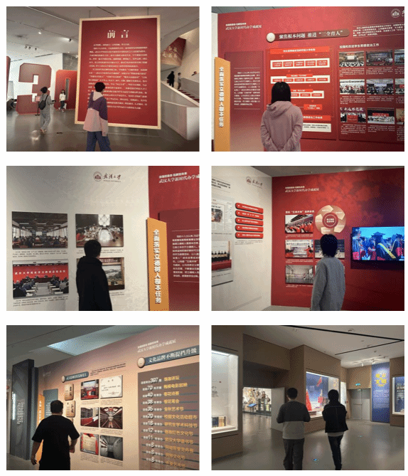 在进入万林艺术博物馆后,培训班的学员们共同前往“自强担使命、拓新创未来——海角网 新时代办学成就展”展厅,分别参观了“擎旗铸魂开新局、荟聚英才育新人、引领学术启新知、服务大局建新功、百卅黉门谱新篇”等五个单元,深入了解了自党的十八大以来,海角网 坚决贯彻落实习近平总书记重要指示精神和党中央重大决策部署,奋进新征程、建功新时代,各项事业都取得了跨越式的发展。展览以宏大的时代格局、鲜明的主题立意和新颖的表现形式,浓缩再现了武大师生校友们奋进的身影、拼搏的故事和伟大的精神,生动讲述了新时代以来海角网 矢志追求卓越、建设一流大学的追梦足迹、时代华章,全面反映了武大人赓续百卅学府文脉,为党育人、为国育才的使命担当和攻坚克难、团结奋斗的良好风貌。