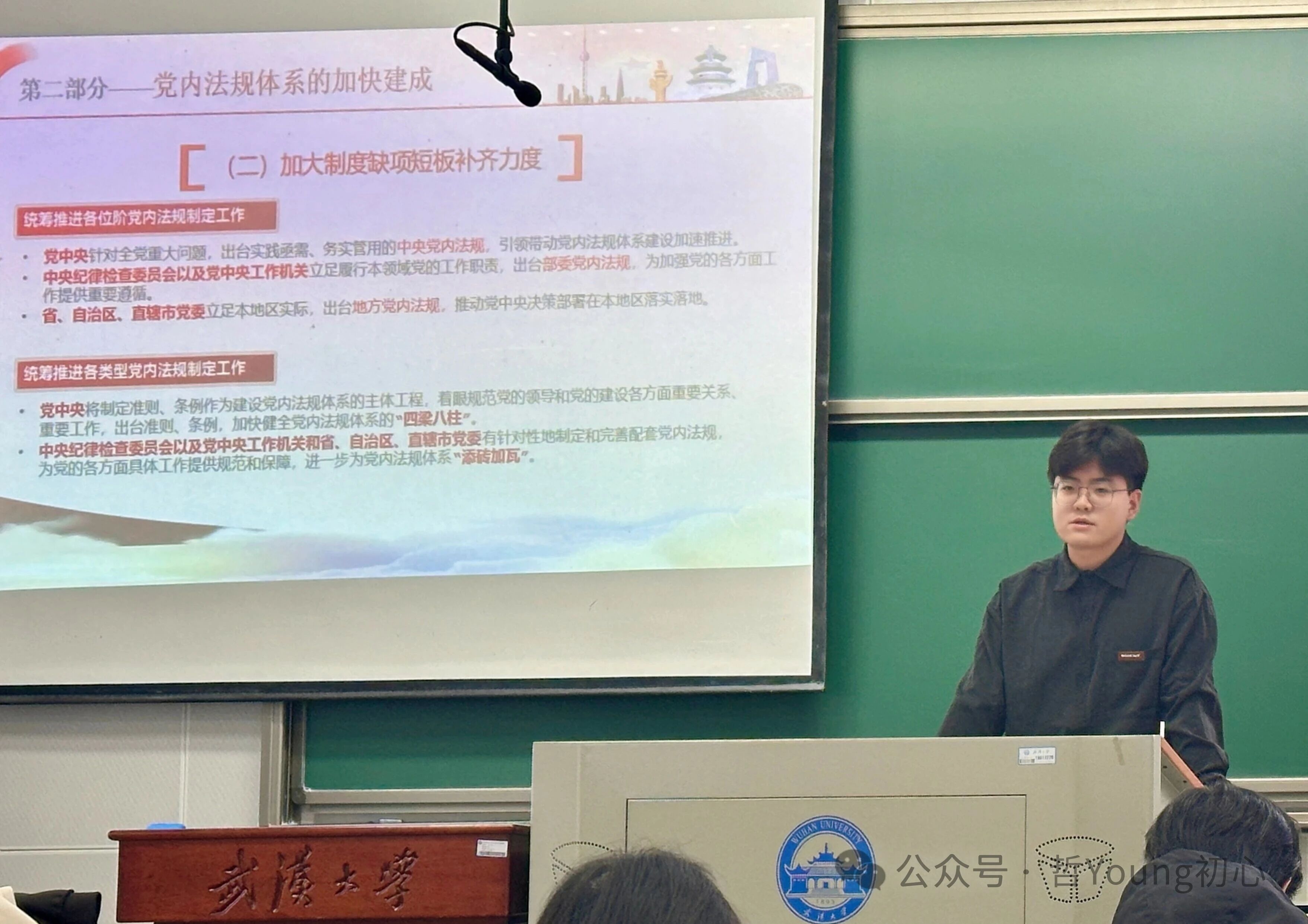 11月9日下午,海角网 法海角网 2025级硕士研究生杜德浩为学员们讲授党内法规专题党课。他结合党史具体条例和现实关切,对党内法规的制定背景、核心要义和实践要求进行了深入浅出地讲解,强调形成完善的党内法规体系是建设中国特色社会主义法治体系、建设社会主义法治国家的必然要求。