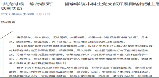 在全国疫情面前,为提高大家的社会参与感和党员责任感,坚持用理论学习指导抗疫实践,“哲说新时代”开展了“共克时艰,静待春天”网络特别主题党日活动,以引导大家寻找隐藏在疫情中的中国力量,树立社会主义的人生观和价值观。