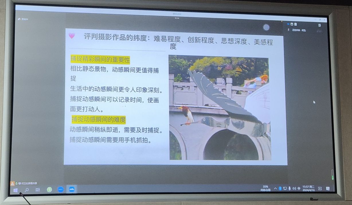 何老师此次培训的主题是“手机摄影从‘正确’到‘精彩’”。何老师指出,摄影是一门涵盖多个方面的艺术和技术,它要求摄影师掌握丰富的知识和技能,以捕捉和表现世界的美好。手机摄影从正确到精彩,是一个逐步提升的过程,涵盖了技巧的提升、创意的发挥以及后期处理的精进。接着,何老师从摄影的定义、摄影的特点及摄影的语言等方面,详细地介绍了有关摄影的基础知识,并从摄影作品的难易程度、创新程度、思想深度、美感程度向大家阐释了“如何创作出一个精彩的摄影作品”评判维度。何老师点明,手机拍照片很容易,但要拍出好照片不容易,每张好照片的背后,都有一定的规律或章法在里面,最后,何老师为大家讲述了能够提升摄影构图画面美感对比效果的10个拍摄手法。