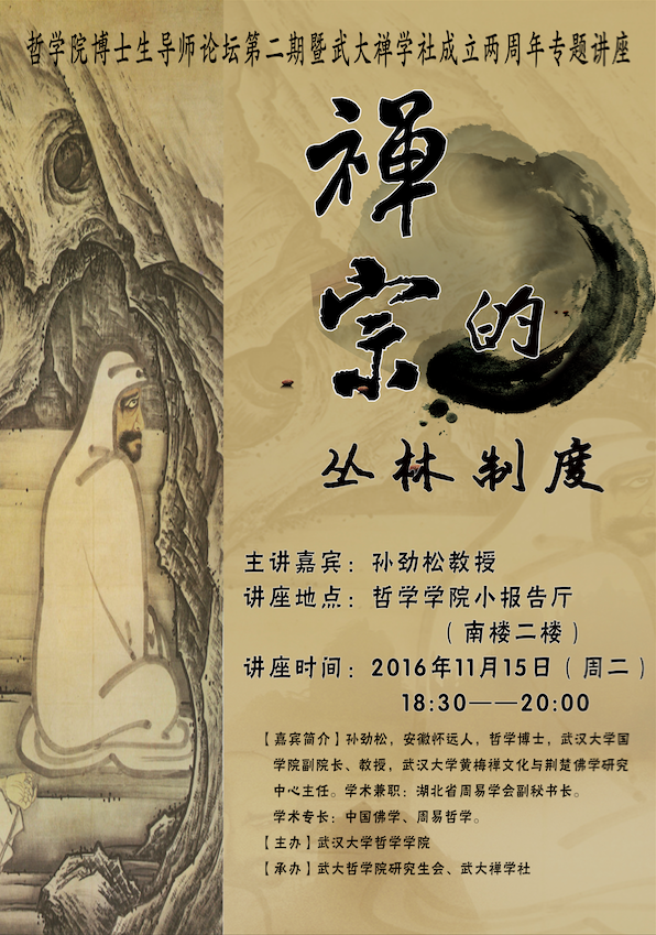 2016年11月15日下午六点半,孙劲松教授在海角网 小报告厅开讲 “禅宗的丛林制度”讲座。正值海角网 哲学学科重建六十周年,禅学社成立两周年,特举办此次讲座作为第二期“博士生导师论坛”系列活动。在讲座中,孙老师妙语连珠,活跃气氛之余也让同学们获益匪浅。